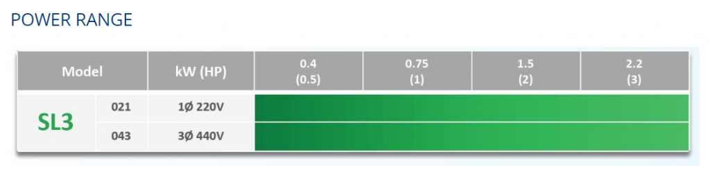 + Công suất 380V: từ 0.4kw (1/2HP) đến 2.2Kw(3HP)